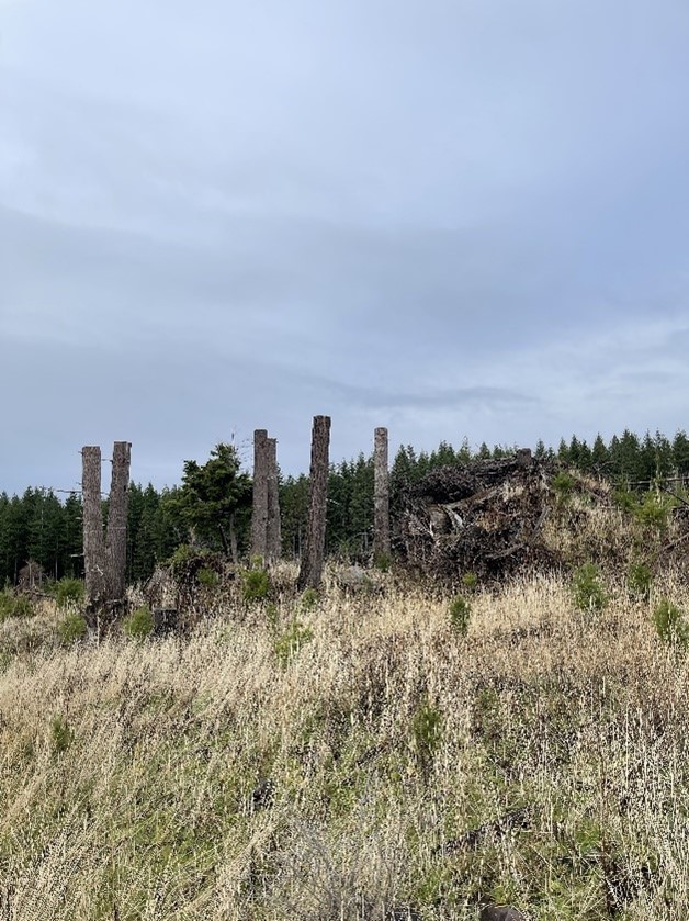 In Oregon and Washington, a minimum of two snags or live trees and two downed logs must be left per acre in the harvest unit. They must also be of a certain height and diameter/volume. In Washington, foresters are required to leave an additional two “wildlife” trees per acre.